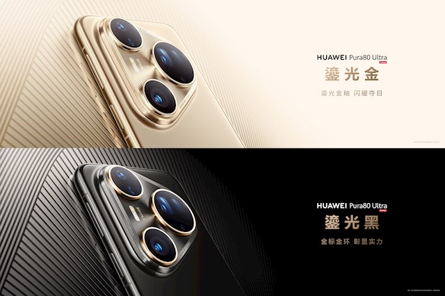 华为Pura 80 Ultra采用光芒耀目的风向标设计,搭配高级珠宝和腕表中经典的太阳饰纹;以XMAGE金标、镜头金环点缀;以专业影像产品的黑金配色为灵感,带来经典的黑金配色:鎏光金和鎏光黑。